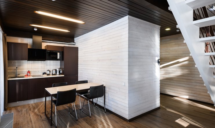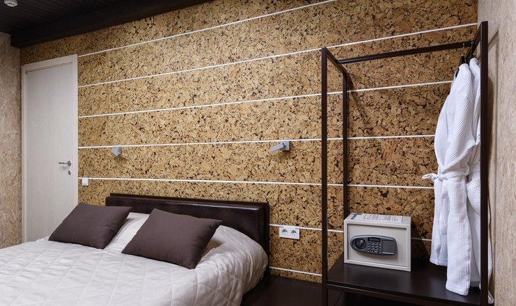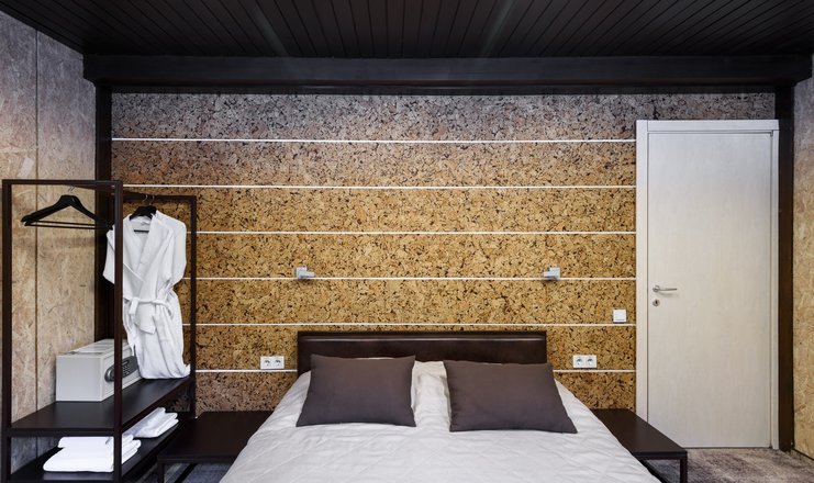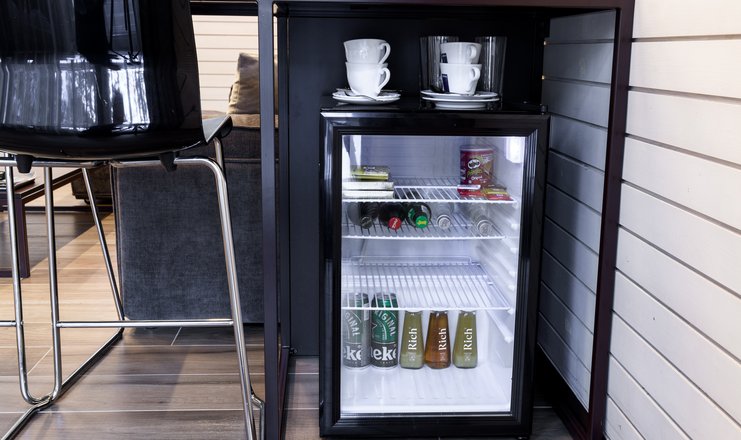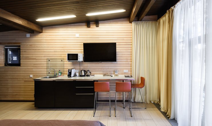 В номере: вешалка, кресло-кровать, кровать двуспальная, обувная полка, прикроватные тумбочки, стулья, Мини-кухня, кофемашина, микроволновая печь, мини-холодильник, сейф, телевизор ЖК, телефон, чайный набор посуды, электрочайник