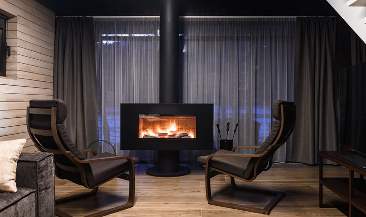 В номере: вешалка: кронштейн для одежды, диван, зеркало, кресла, кровать двуспальная, прикроватные тумбочки, стол, стол для компьютера, столик журнальный, стулья, гладильная доска, духовой шкаф, кофемашина, микроволновая печь, набор посуды, плита электрическая, телевизор ЖК, телефон, утюг, холодильник, электрочайник