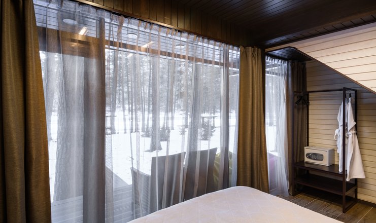 В номере: вешалка: кронштейн для одежды, диван, зеркало, кресло, кровать двуспальная, обувная полка, прикроватные тумбочки, столик журнальный, стулья, кофемашина, мини-холодильник, набор посуды, сейф, телевизор ЖК, телефон, электрочайник