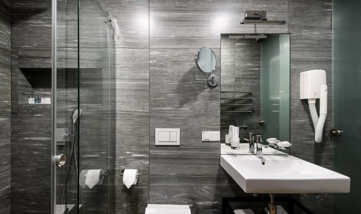 Санузел: с душевой кабиной, тапочки, туалетные принадлежности, фен, халат