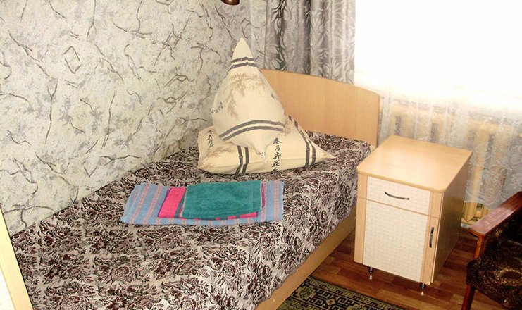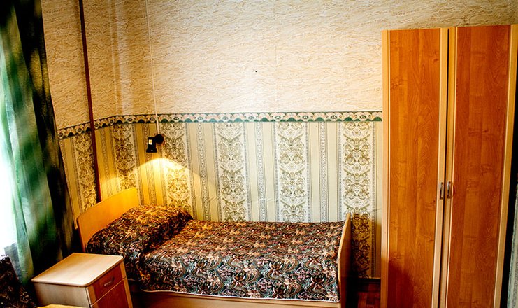 Оснащение номера: односпальная кровать, прикроватная тумбочка, стол, стул, шкаф, зеркало, телевизор, утюг, электрочайник, холодильник (в холле)