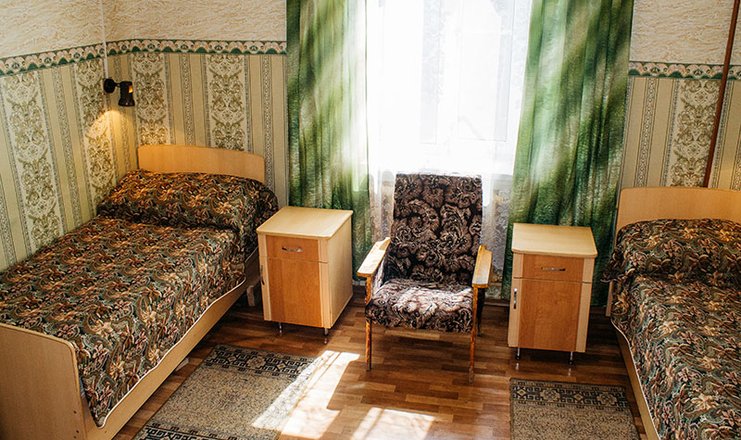 Оснащение номера: две односпальные кровати, прикроватные тумбочки, стол, стулья, кресло, шкаф для одежды, зеркало, телевизор, утюг, электрочайник, холодильник ( в холле)