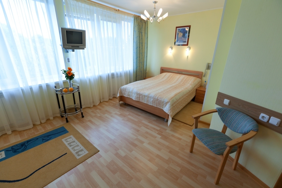 Описание: просторный однокомнатный номер для размещения одного человека или семьи. По комфортности это номер класса "Люкс", отличие состоит в том, что он не разделен на 2 помещения (гостиная и спальня). Места для сна, отдыха, чаепития выделены при помощи зонирования.