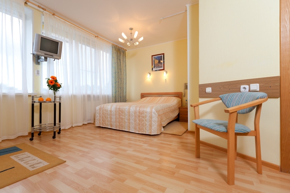 В номере: кровать, шкаф, стол, кресло, стулья, тумбочка, зеркало, телевизор, телефон, холодильник