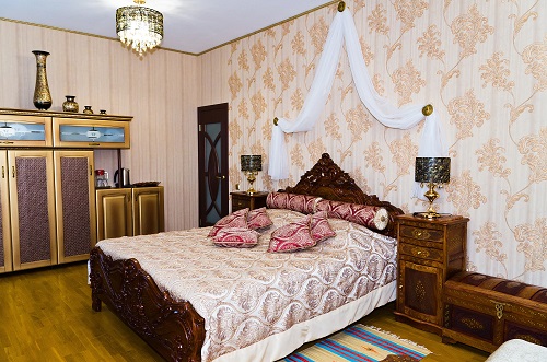 В номере: диван, телевизор, телефон, холодильник, радио, стенка-горка с посудой, журнальный столик, двуспальная кровать, комод.
