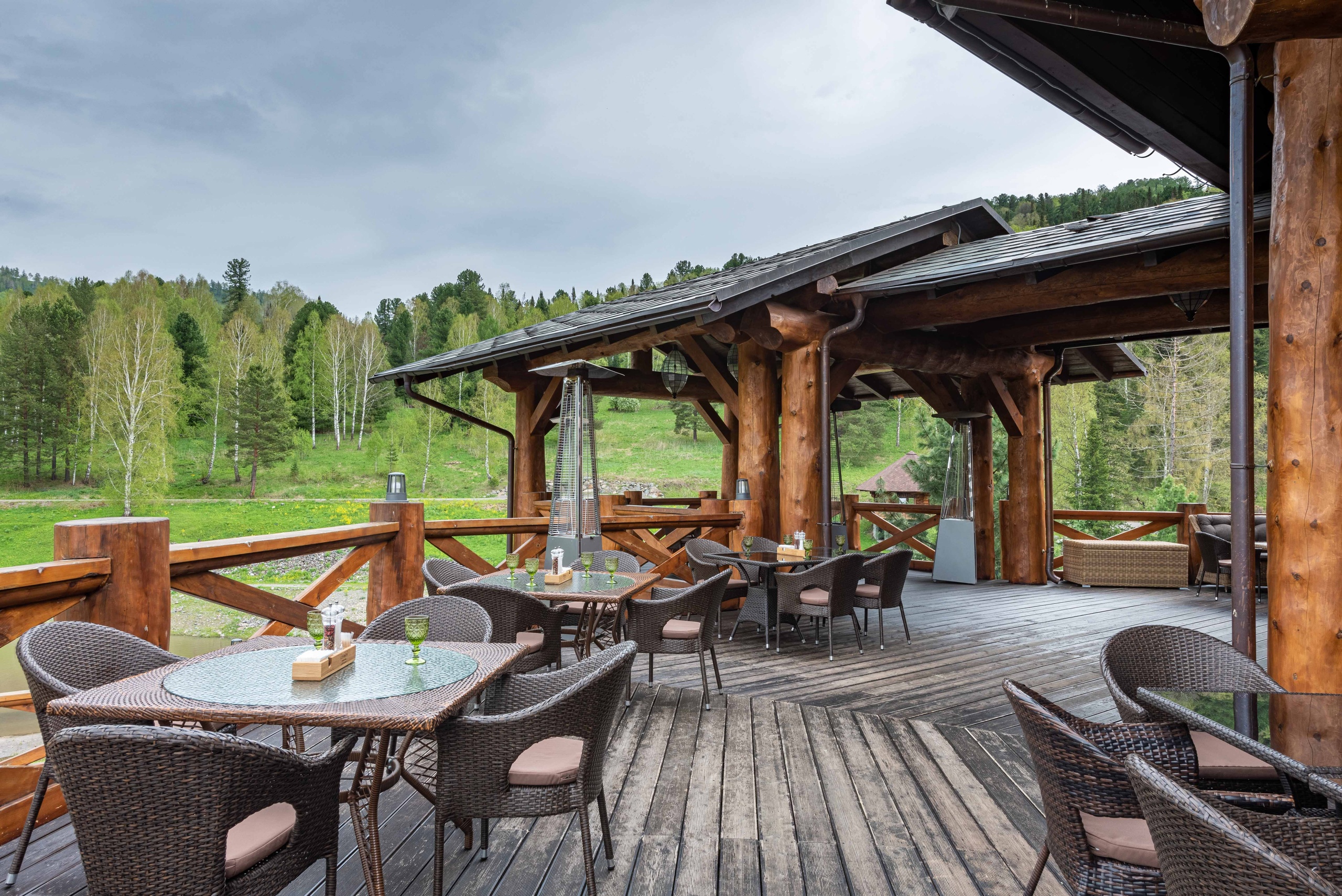 Живописная видовая терраса в теплое время года привлекает посетителей для наслаждения закатами, а два этажа ресторана создают комфортное пространство для проведения мероприятий в неповторимой атмосфере единения с природой Алтая.