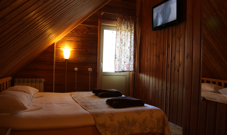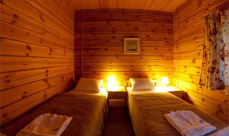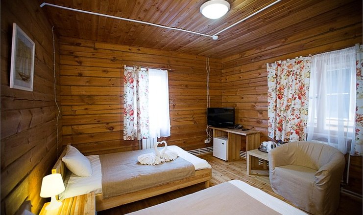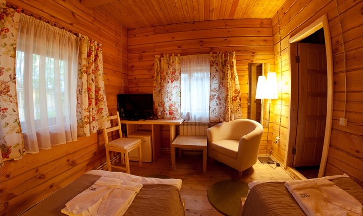 В номере: кровати полутороспальные, прикроватные тумбочки, стол, стул, шкаф, кондиционер, телевизор ЖК, телефон, холодильник, чайный набор посуды, электрочайник