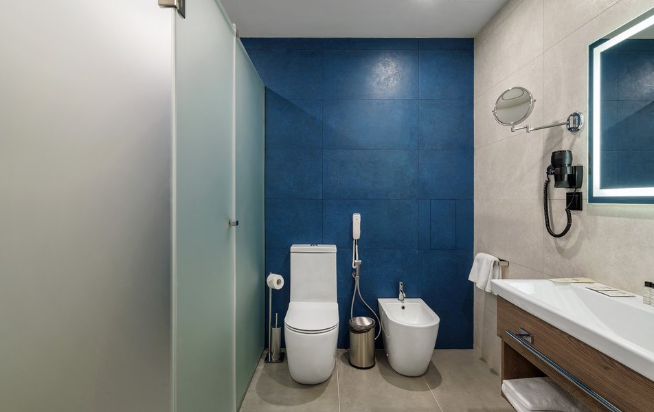 Санузел: биде, с душевой кабиной, тапочки, туалетные принадлежности, фен, халат