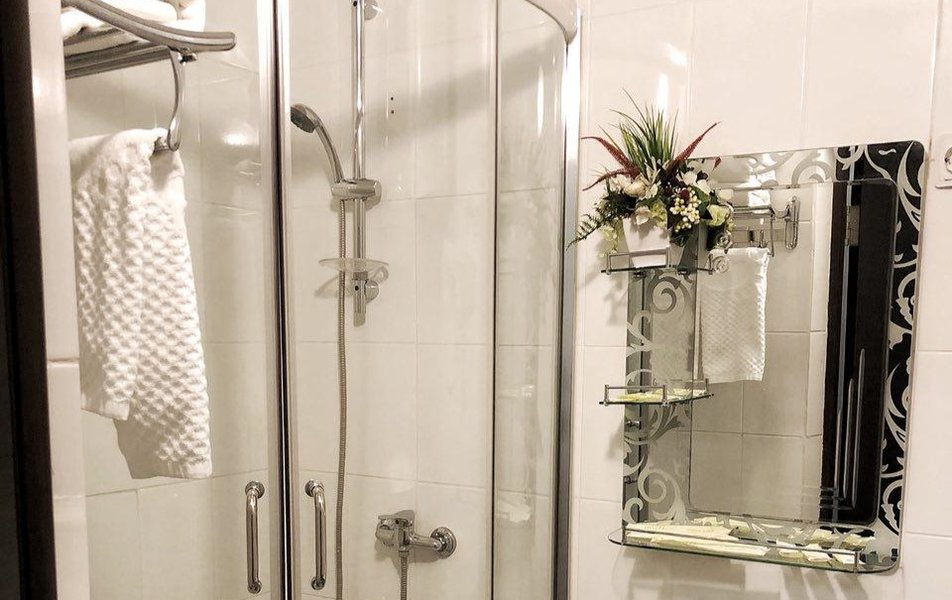Санузел: с душевой кабиной, тапочки, туалетные прин-ти, фен, халат