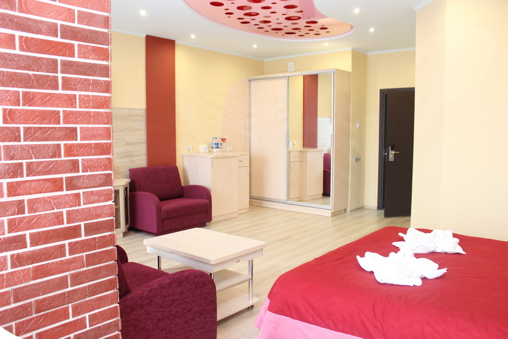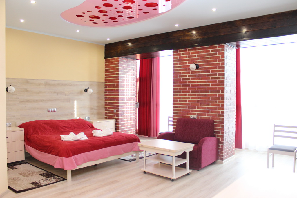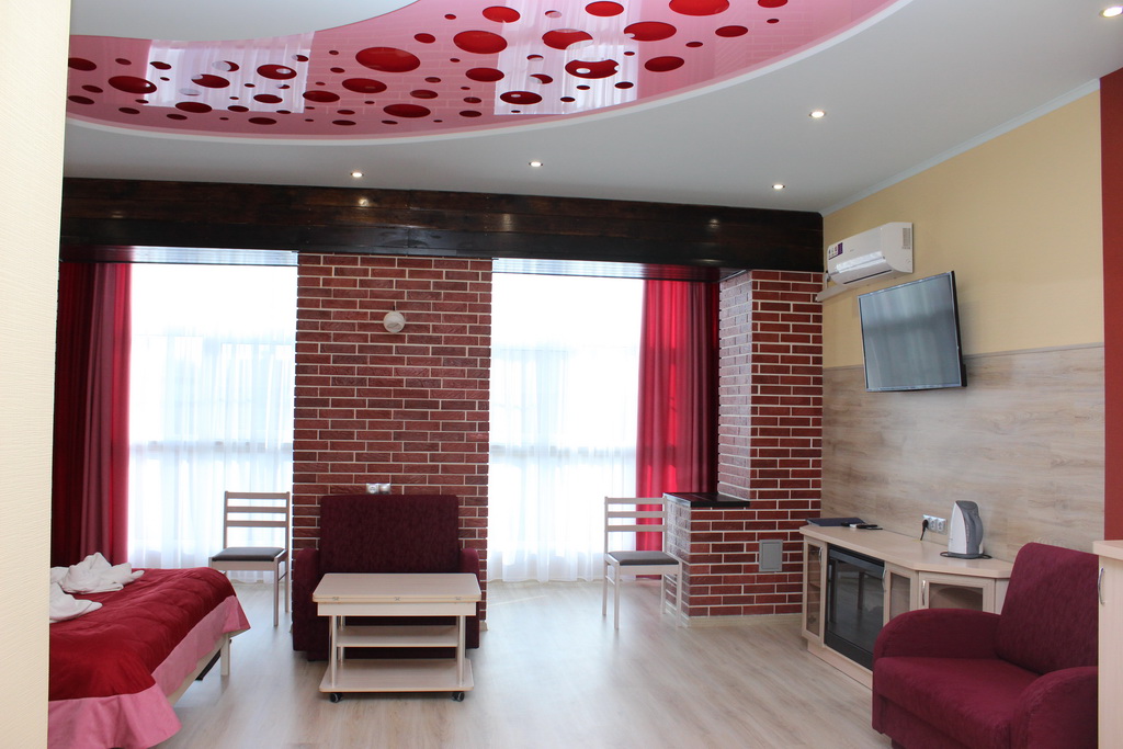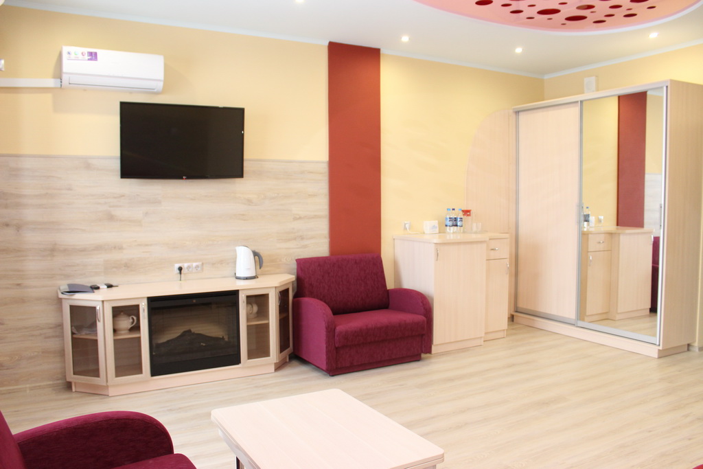 В номере: двуспальная кровать, прикроватные тумбы, стол, стулья, шкаф, два раскладывающихся кресла, журнальный столик, телевизор, холодильник, электрокамин, кондиционер, сейф, фен, электрочайник, утюг, гладильная доска, стиральная машина, набор посуды, лоджия