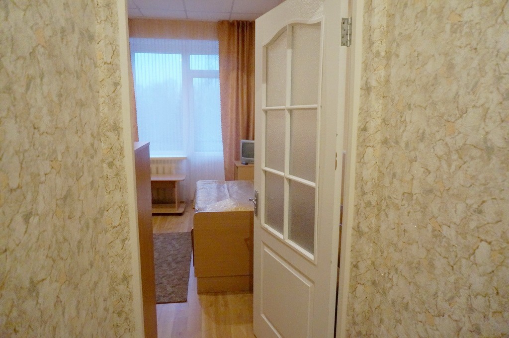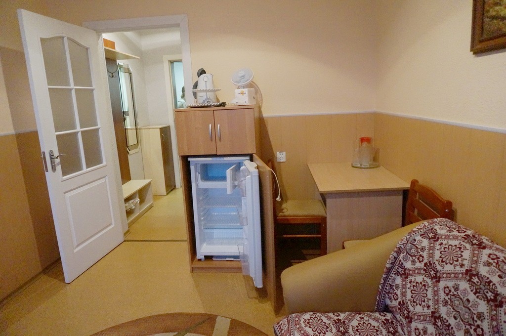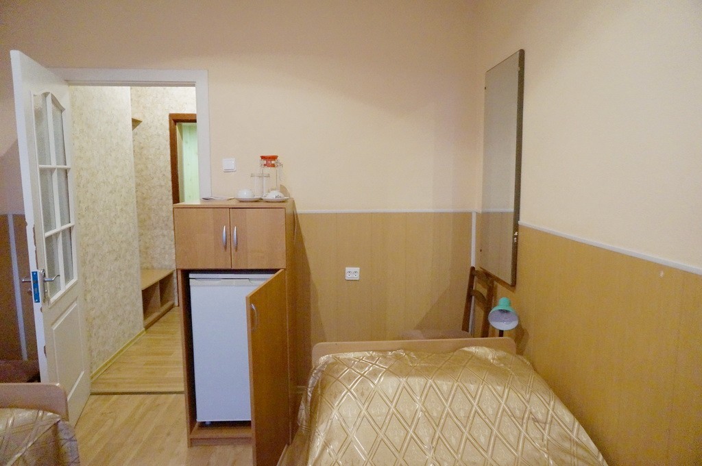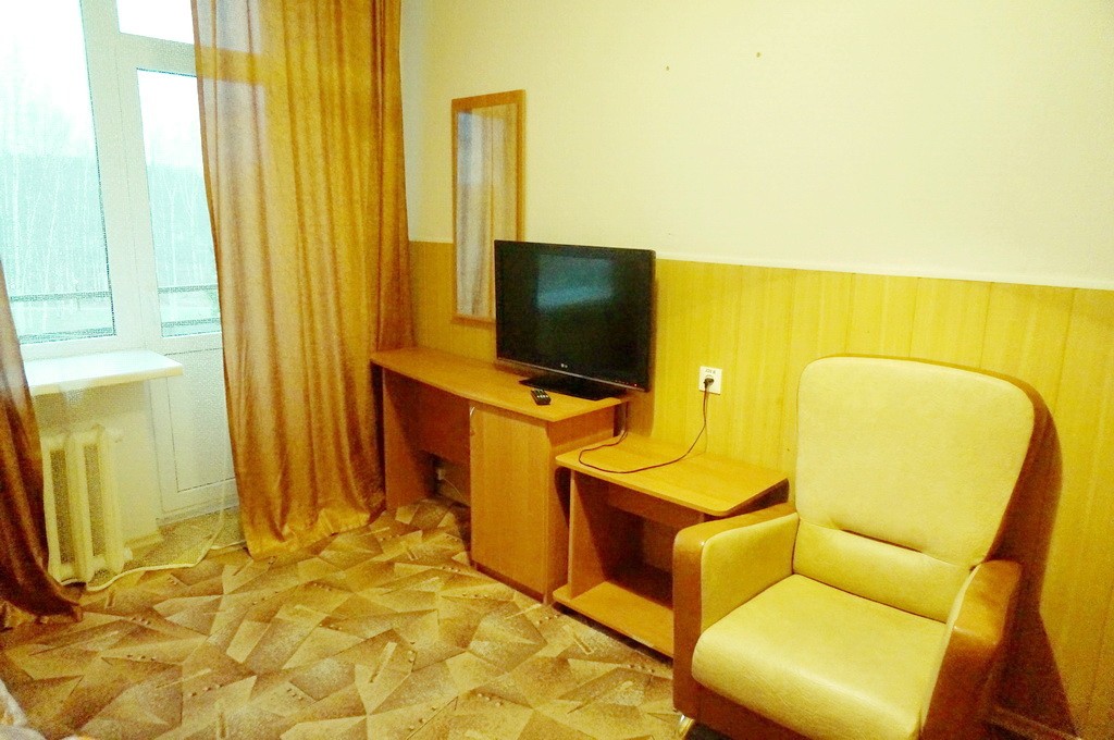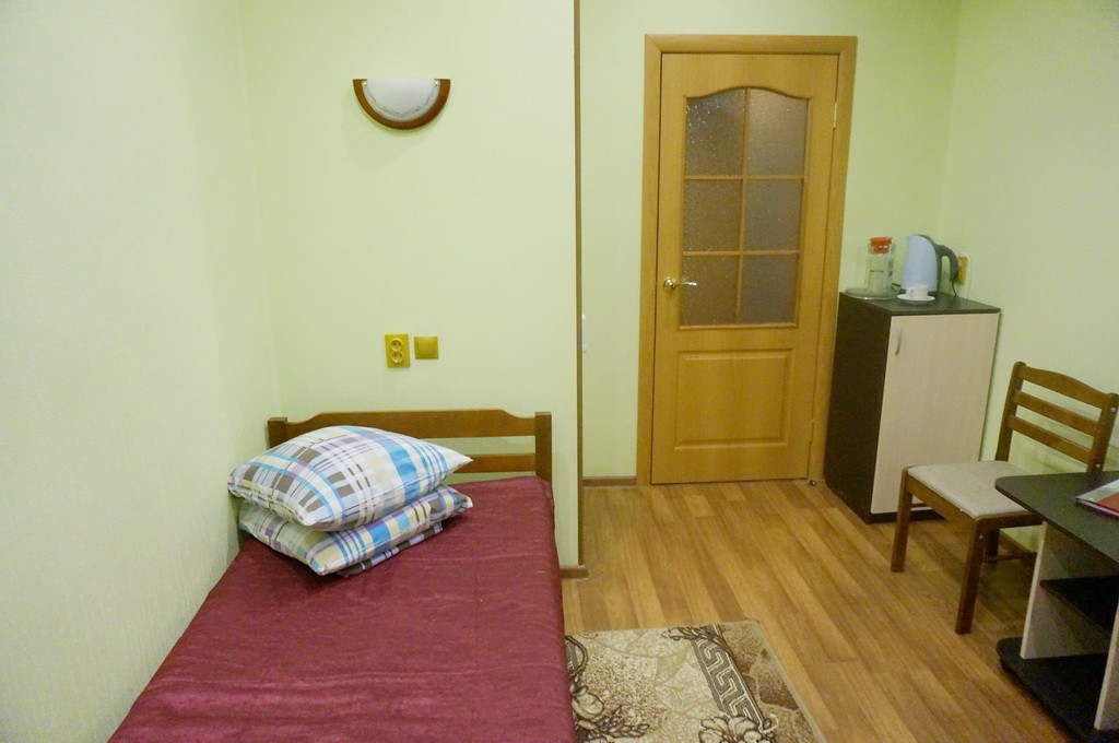 В номере: односпальная кровать, прикроватная тумба, стол, стул, шкаф, кресло раскладывающееся, телевизор, холодильник, электрочайник, набор посуды