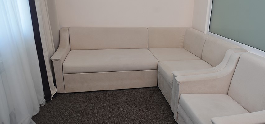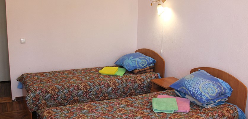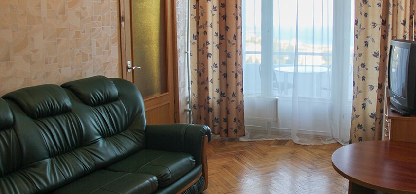 В номере: две односпальные кровати, шкаф, прикроватные тумбы, журнальный столик, стулья, дополнительное место - раскладушка и диван, холодильник, телевизор, кондиционер, набор посуды