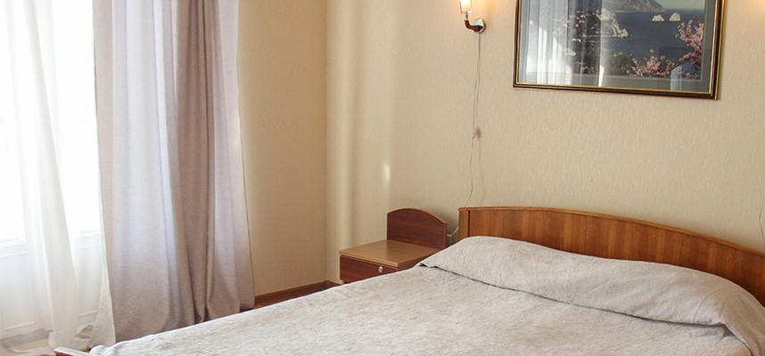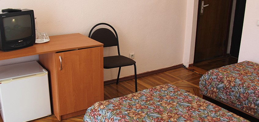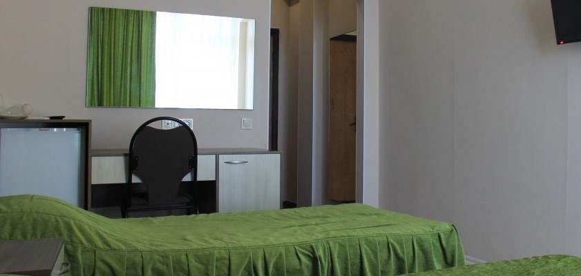 В номере: две односпальные кровати, платяной шкаф, прикроватные тумбы, туалетный столик, стулья, дополнительное место (раскладушка), набор посуды, холодильник, телевизор, кондиционер