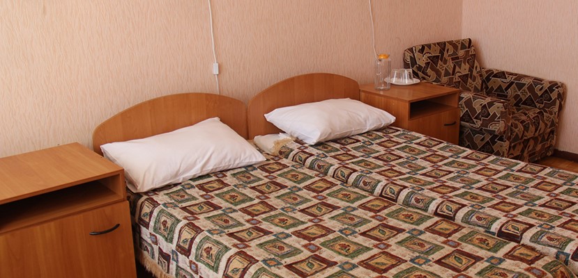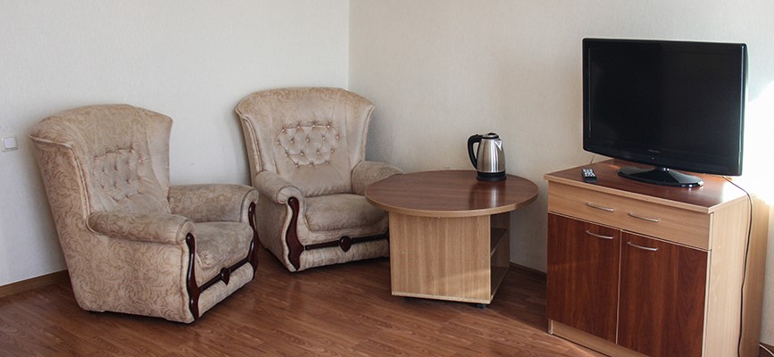 В номере: односпальные кровати, прикроватные тумбы, письменный стол, кресло (в 3-х местном номере), диван (в 4-х местном номере), набор посуды, холодильник, телевизор, климат-контроль