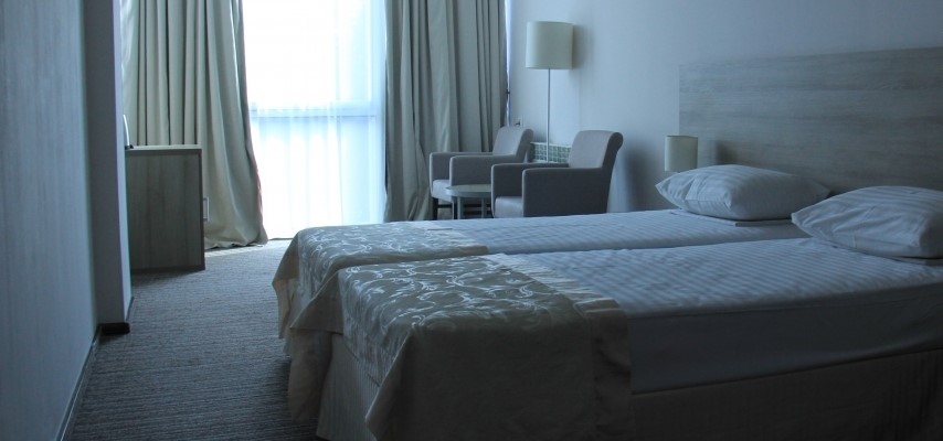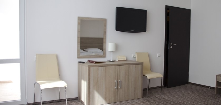 В номере: две односпальные кровати, платяной шкаф, прикроватные тумбы, туалетный столик, стулья, дополнительное место - кресло, набор посуды, холодильник, телевизор, кондиционер