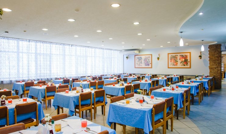 Корпус «Алмаз», ресторан. Залы самообслуживания по системе "шведский стол" на 190 и 160 мест, где порционирование и выдача супов и вторых блюд осуществляется поварами. Обратите внимание, что вынос еды и посуды из обеденного зала не предусмотрен.