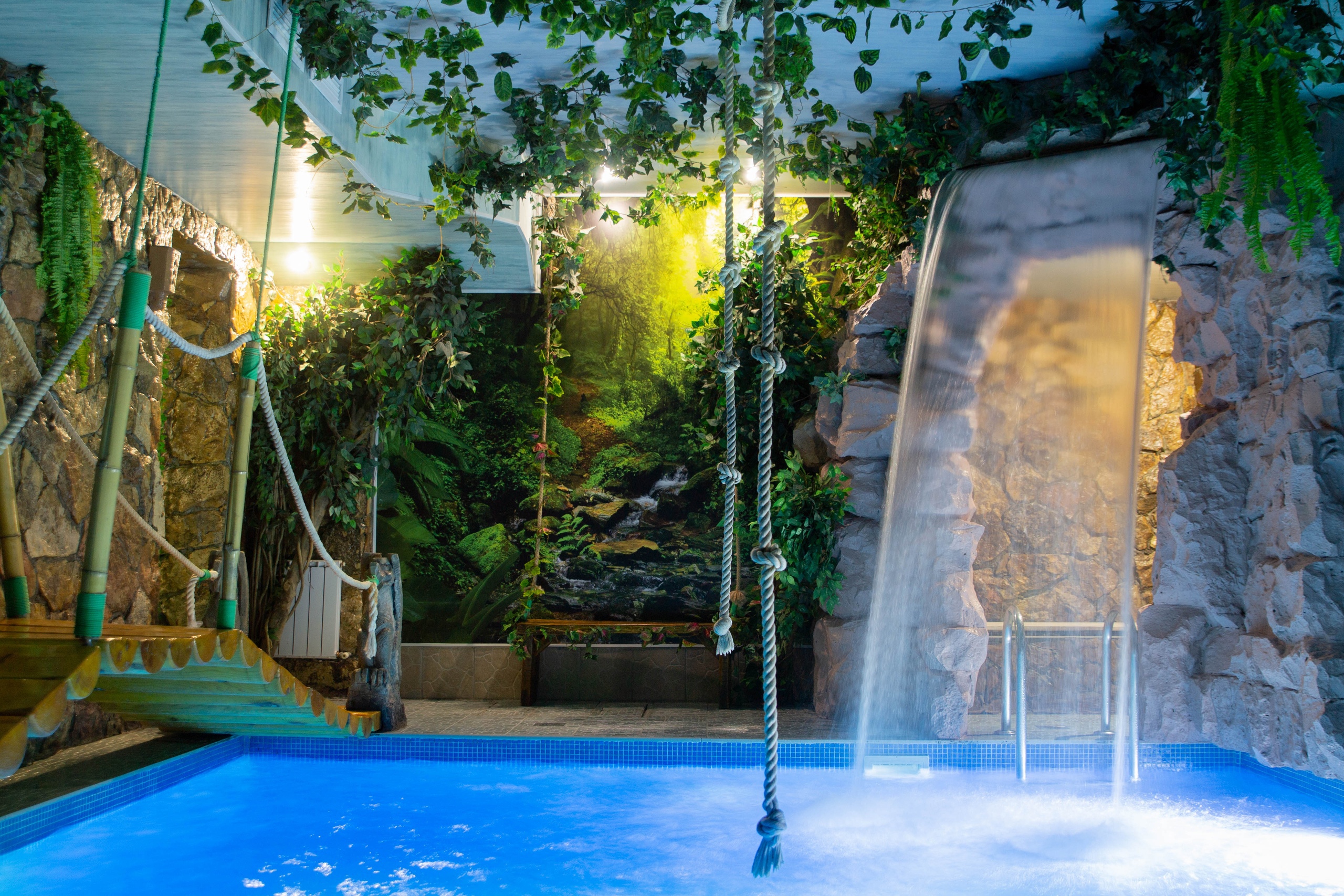 Погрузитесь в атмосферу Гавайских островов с успокаивающим двойным гидромассажем, пышной тропической зеленью, большим водопадом, мостиком и двумя тарзанками. Здесь вас ждёт большой (5м х 5м) тёплый (30-32°C) бассейн с чистейшей, гипоаллергенной водой, финская сауна, комната отдыха и просторная обеденная зона. Зал "Джунгли" рассчитан на 8 человек (за дополнительную плату возможно больше).