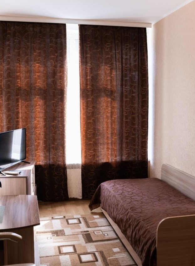 В номере: односпальная кровать, прикроватная тумба, стол, стул, шкаф, тумба под телевизор, холодильник. телевизор, телефон