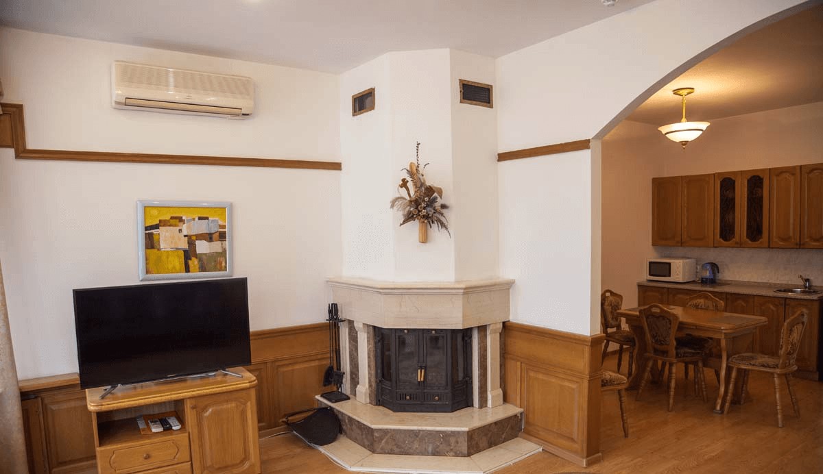 В номере: полутораспальная кровать, прикроватные тумбы, стол, стул, диван, шкаф, холодильник, электрочайник, микроволновая печь, телевизор, телефон