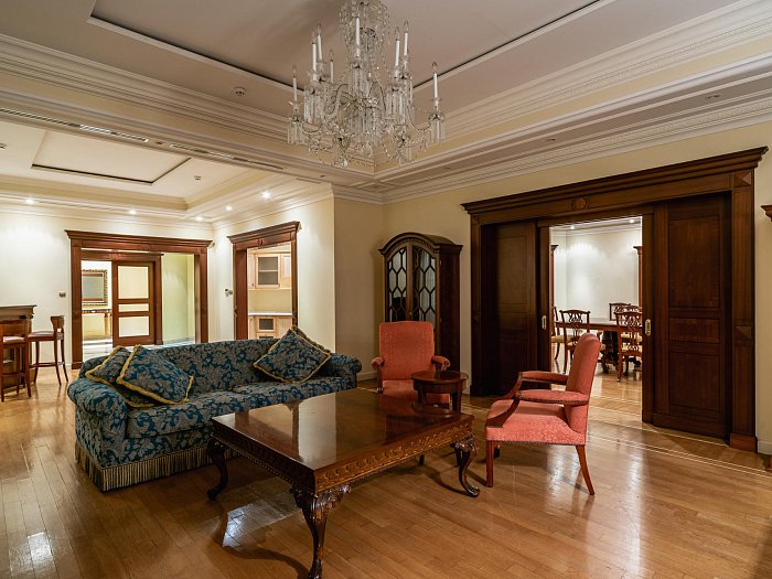 В номере: прихожая, гостиная, две спальни с гардеробом, две ванные комнаты, кухня, обеденный зал с камином, бильярдная, бассейн, сауна, кабинет для массажа, переговорной
