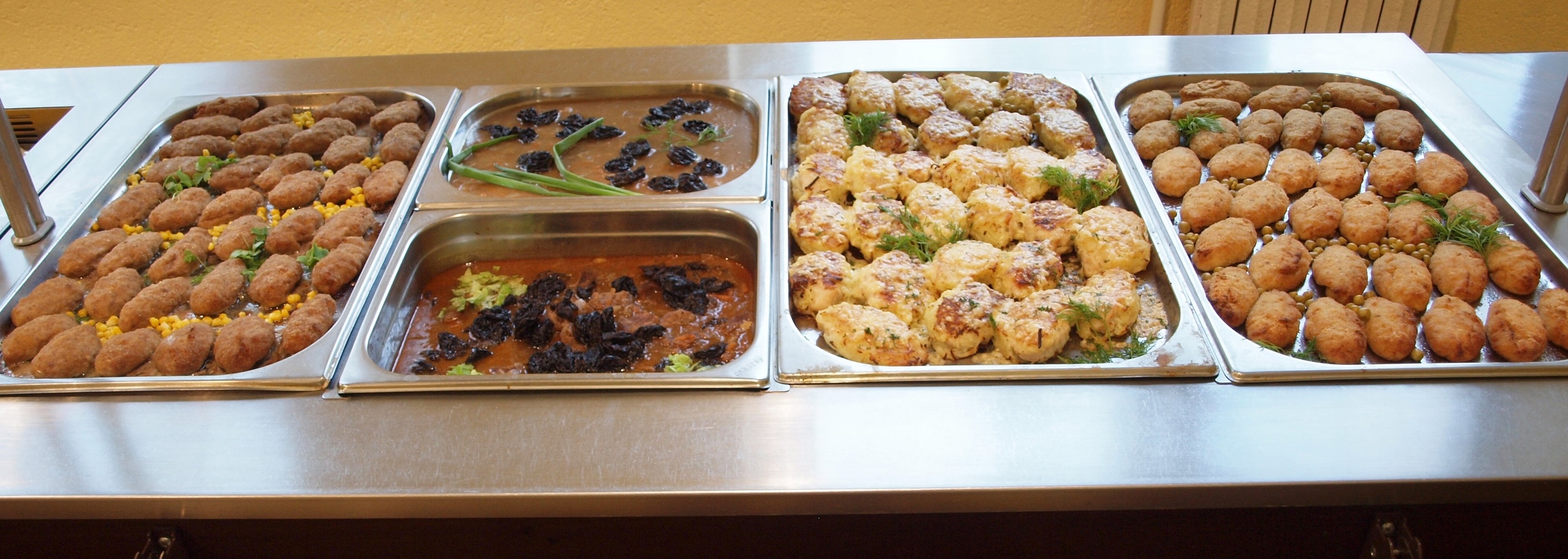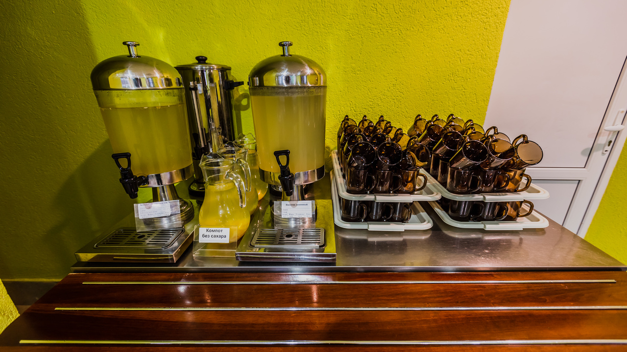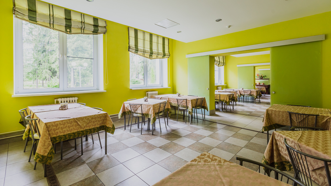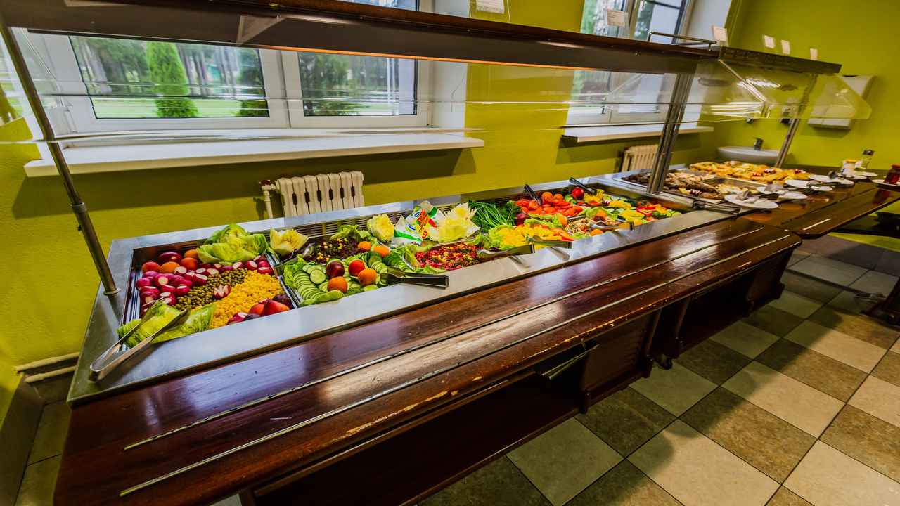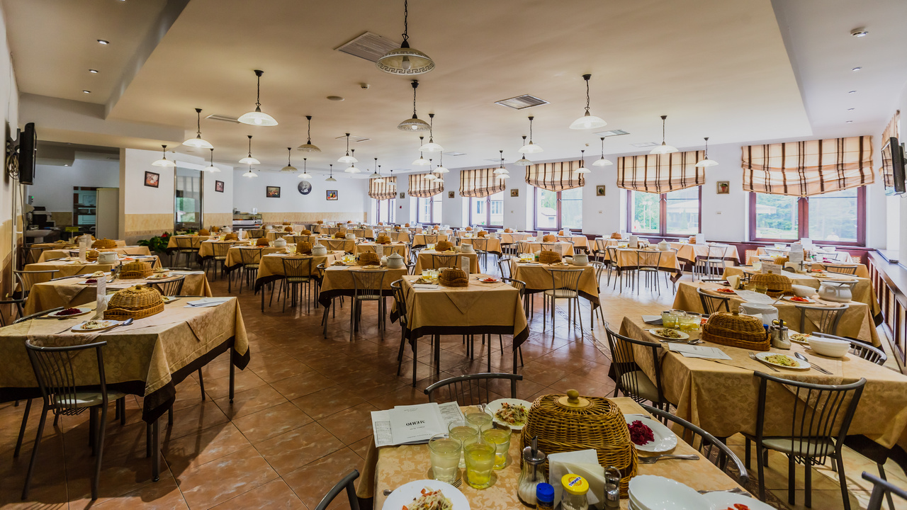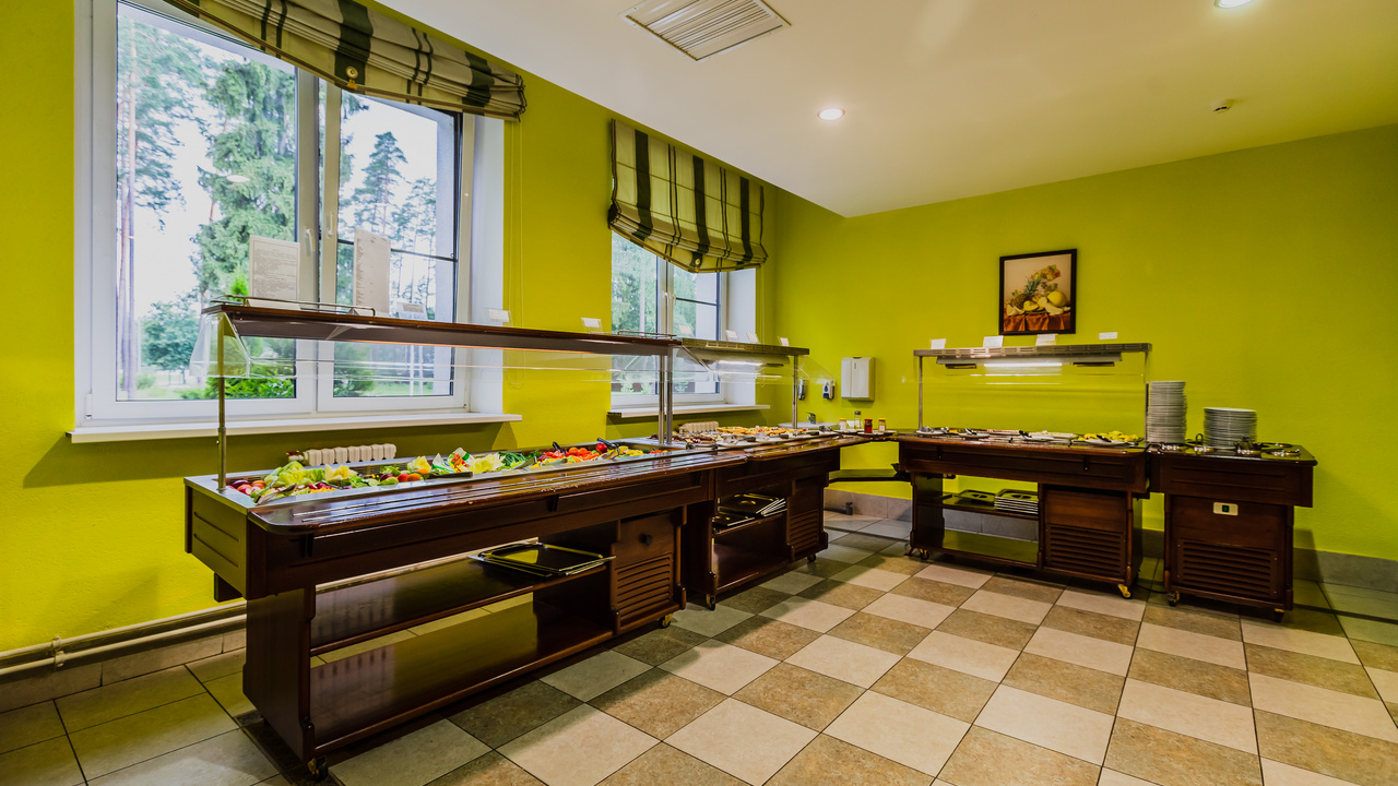 Для гостей разработано заказное двухнедельное меню с учетом сезонности. В столовой санатория имеется зал для питания по системе "заказное меню" на 140 человек и зал для питания по системе "шведский стол" на 80 человек.