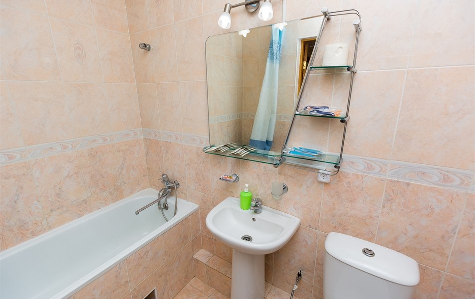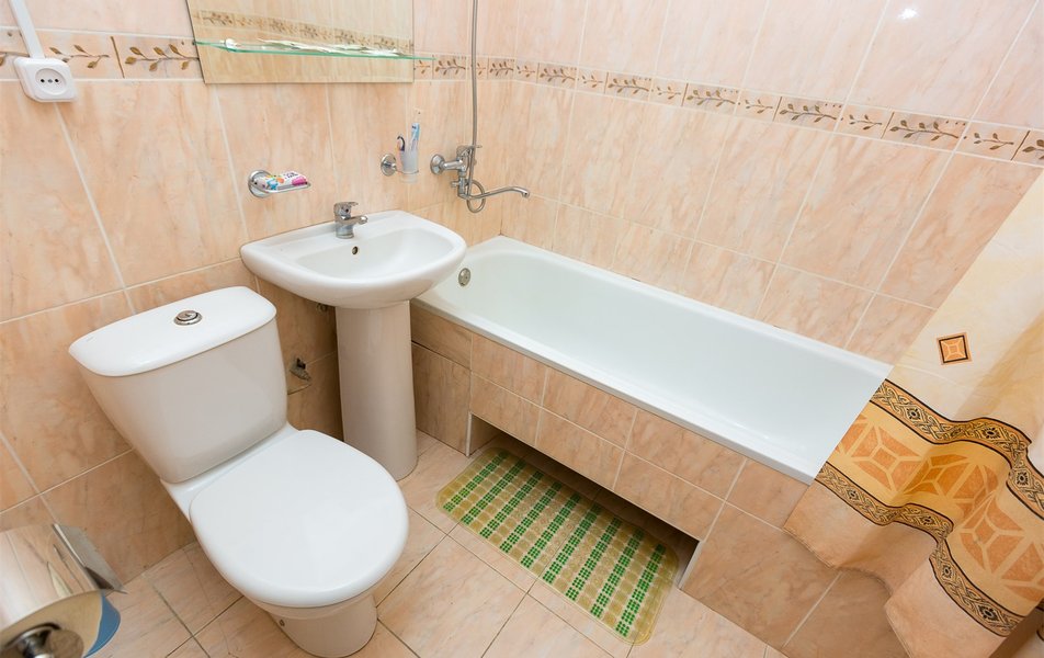 Санузел: ванна, раковина, унитаз, туалетные принадлежности, фен