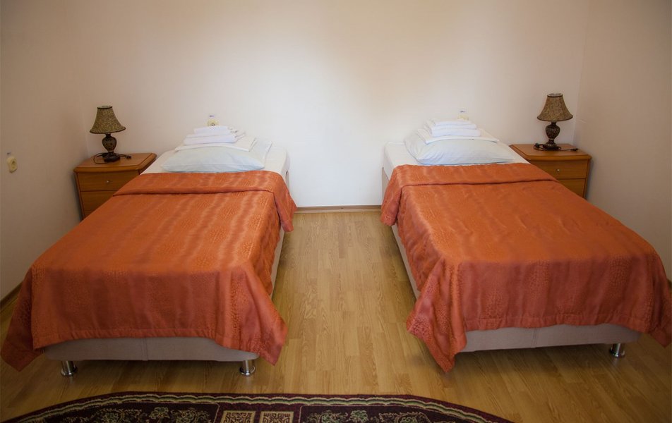 В номере: вешалка, зеркало, кресло, диван, кровати односпальные, двуспальная кровать, прикроватные тумбочки, стол, столик журнальный, шкаф, телевизор, телефон, холодильник, чайный набор посуды, электрочайник