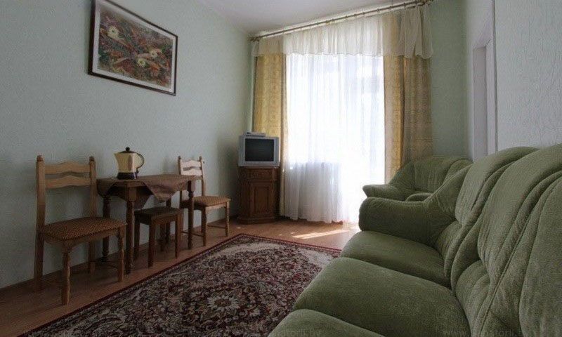 В номере: две комнаты: спальня и гостиная с кухней, кровати односпальные /одна двуспальная кровать, прикроватные тумбочки, стол, стулья, шкаф, мягкая мебель, кондиционер, набор посуды, телевизор, холодильник, электрочайник