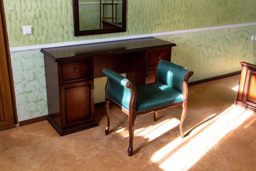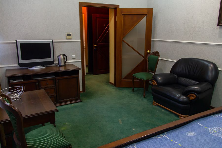 Оснащение номера: двуспальная кровать, прикроватные тумбочки, стол, стулья, шкаф для одежды, диван, сейф, система кондиционирования, телевизор, телефон, холодильник, электрический чайник