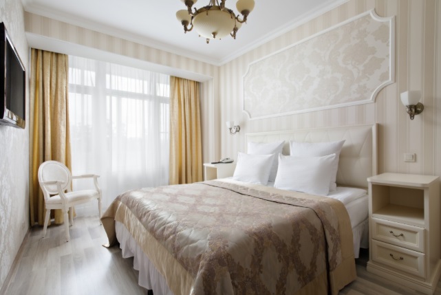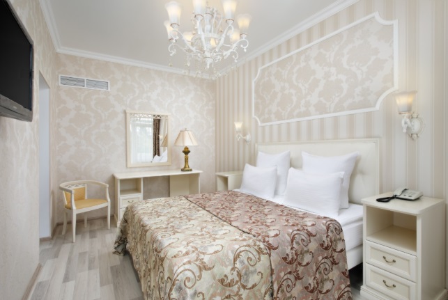 В номере: полутораспальная кровать, тумбы прикроватные, стол, стулья, телевизор, холодильник, сейф, электрический чайник