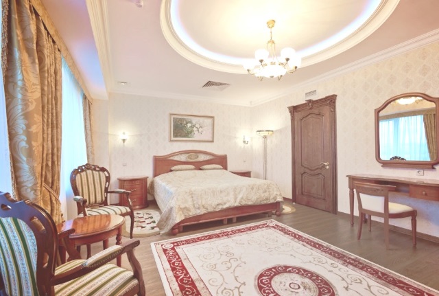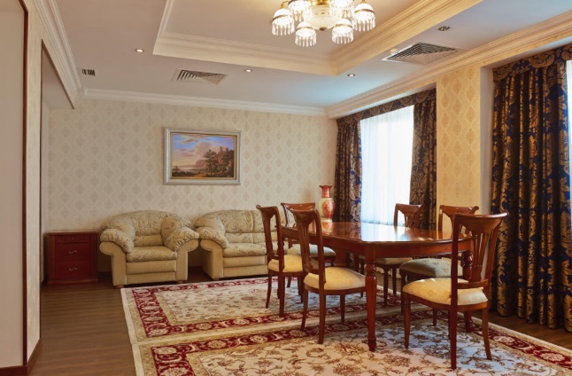 В номере: две комнаты: спальня и гостиная, двуспальная кровать, тумбы прикроватные, стол, стулья, мягкая мебель, телевизор с кабельным телевидением, холодильник, сейф, электрический чайник, телефон, кондиционер