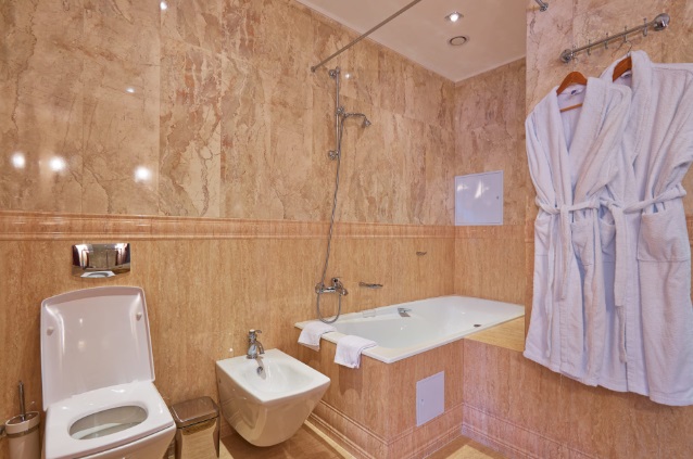 Санузел: раковина, унитаз, ванна, душевая кабина, биде, фен