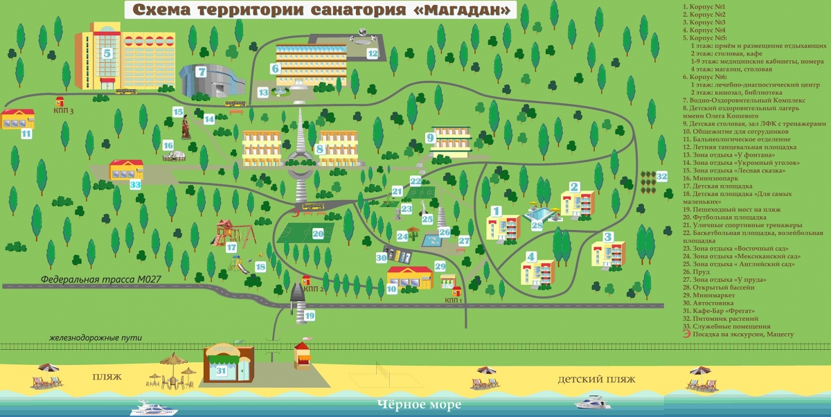Санаторий «Магадан» расположен на территории собственного парка, в 58 км от аэропорта г. Адлер, в 28 км от центра г. Сочи, в 2 км от ж/д станции Лоо.