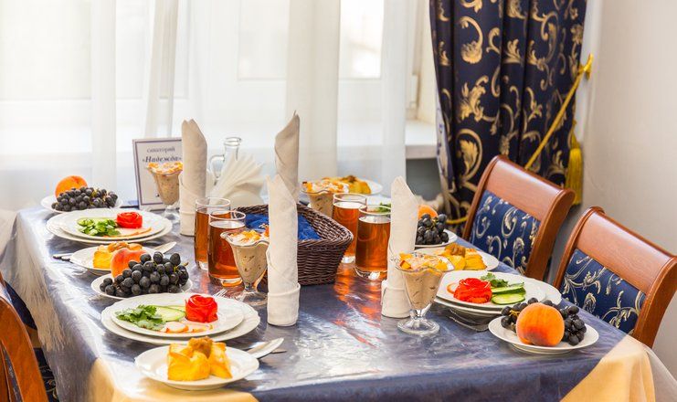 В санатории «Надежда» (Ессентуки) организовано 3-х разовое диетическое питание по системе «меню-заказ». Из множества блюд, приготовленных с учетом особенностей того или иного заболевания, можно выбрать те, которые вы хотели бы отведать. Питание базируется на 15-ти проверенных диетах, составленных на основе научного подхода.