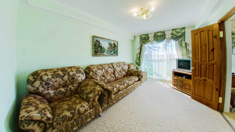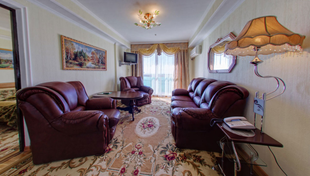 В номере: две комнаты: спальня и гостиная, двуспальная кровать, прикроватные тумбы, посудный шкаф, стол, стулья, комод, пуф, мягкая мебель, шкаф/гардероб, мини-холодильник, телевизор, телефон, кондиционер