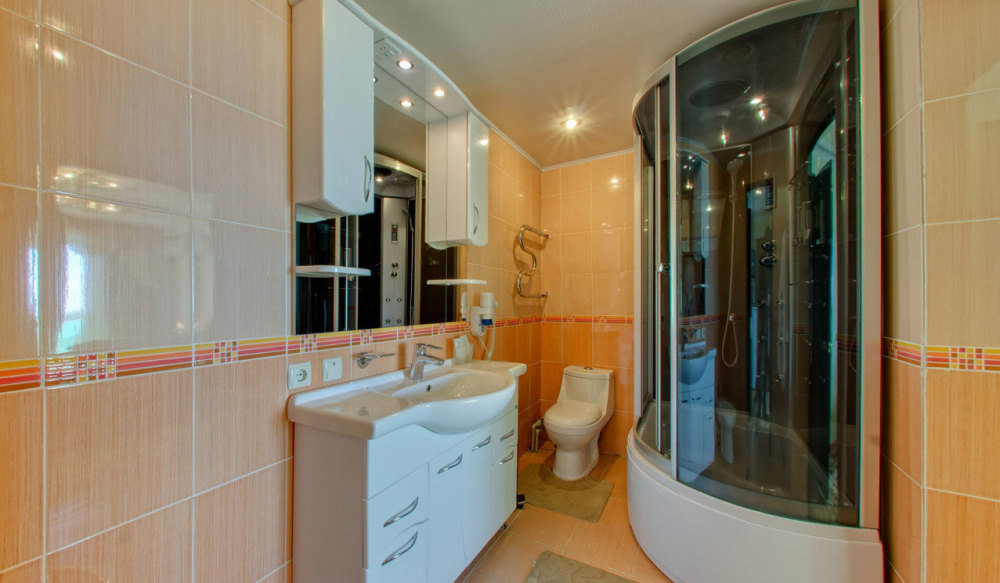 Санузел: унитаз, раковина, душевая кабина, фен