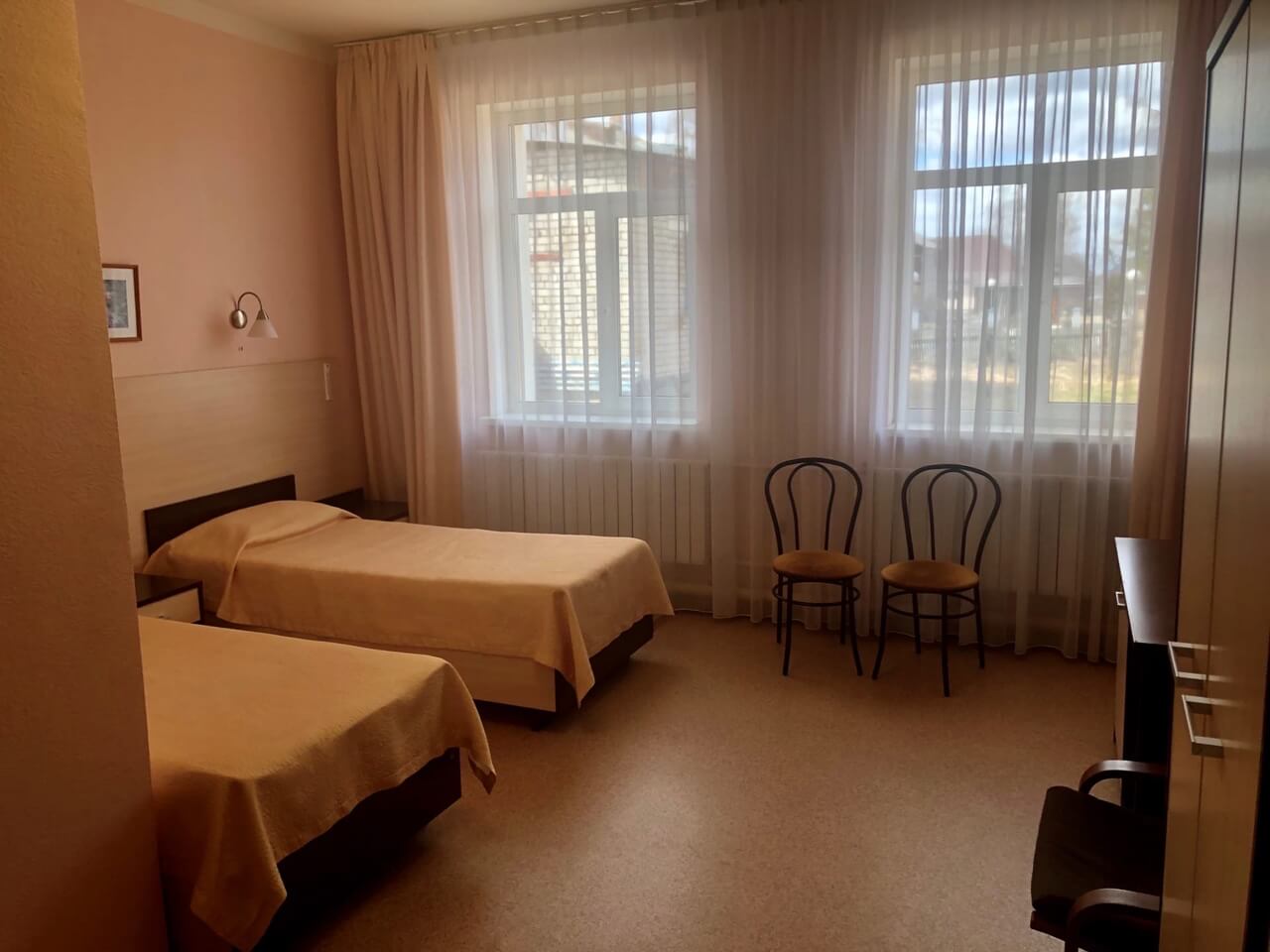 В номере: вешалка, зеркало, кровати односпальные: 2, прикроватные тумбочки, стол, стулья, шкаф, телевизор
