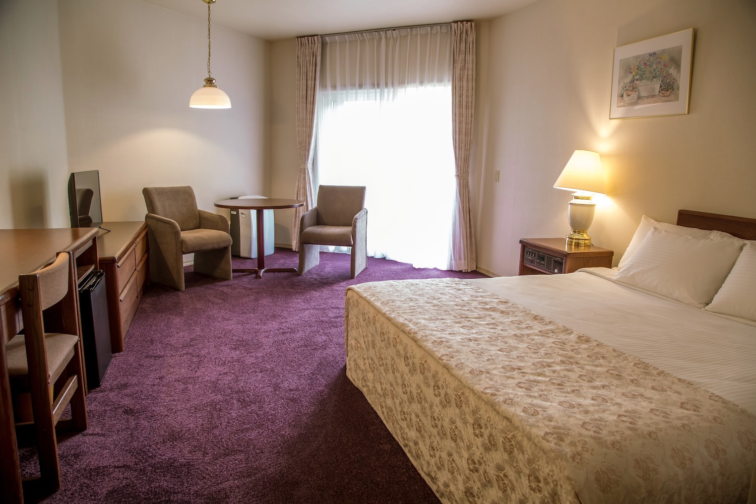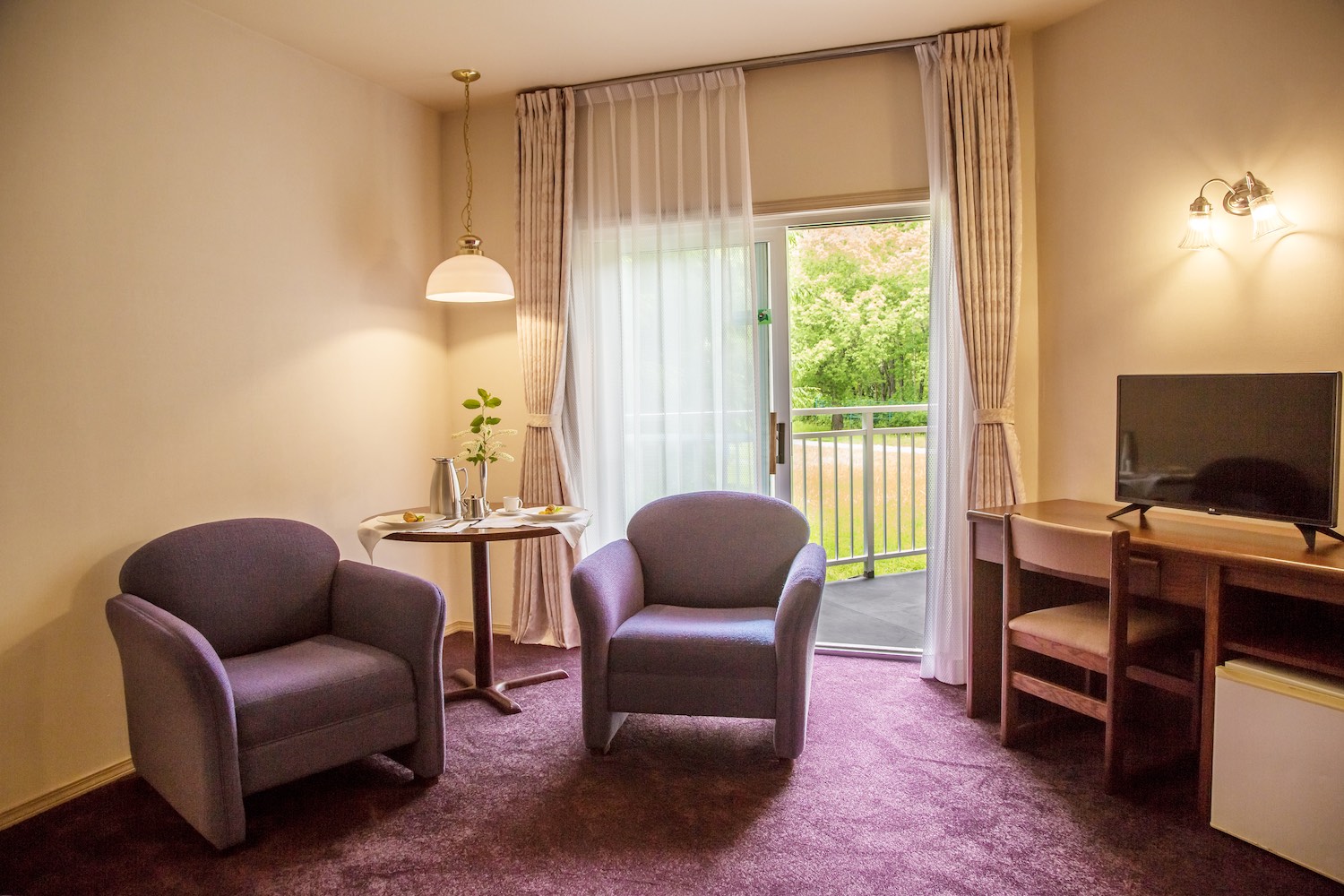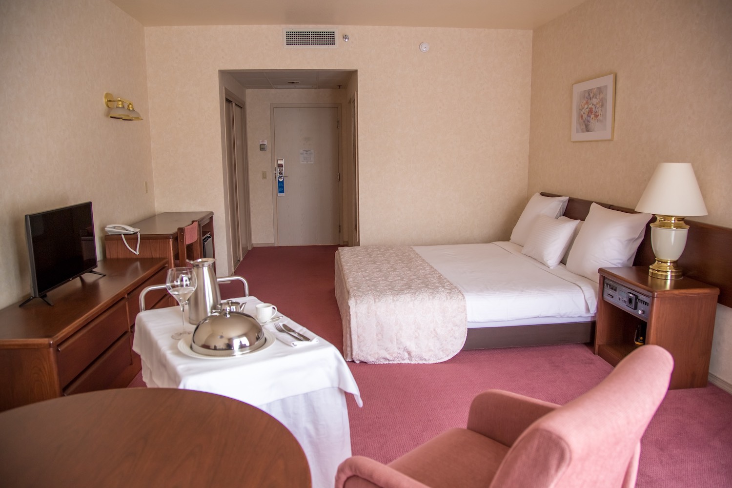 В номере: вешалка, зеркало, кровать двуспальная, прикроватные тумбочки, стол, стулья, шкаф, индивидуальная система обогрева, кондиционер, мини-холодильник, сейф, телевизор, телефон, электрочайник