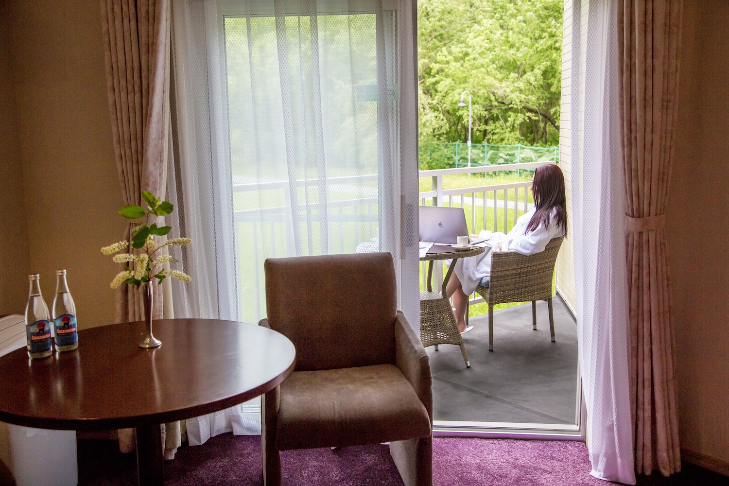 В номере: гостиная, мини-кухня, 2 гардероба, двуспальная кровать 210-200 см (производство Япония), 4 пуховые подушки (производство Финляндия), антибактериальное одеяло и льняное белье, мебель из натурального дерева, возможна установка 1 доп. кровати 90 х 190 см