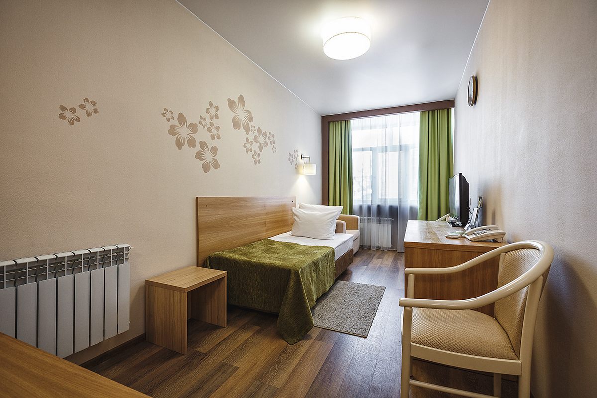 В номере: кровать односпальная, прикроватная тумбочка, стол, шкаф, кресло, телевизор, холодильник, телефон, сушилка для белья