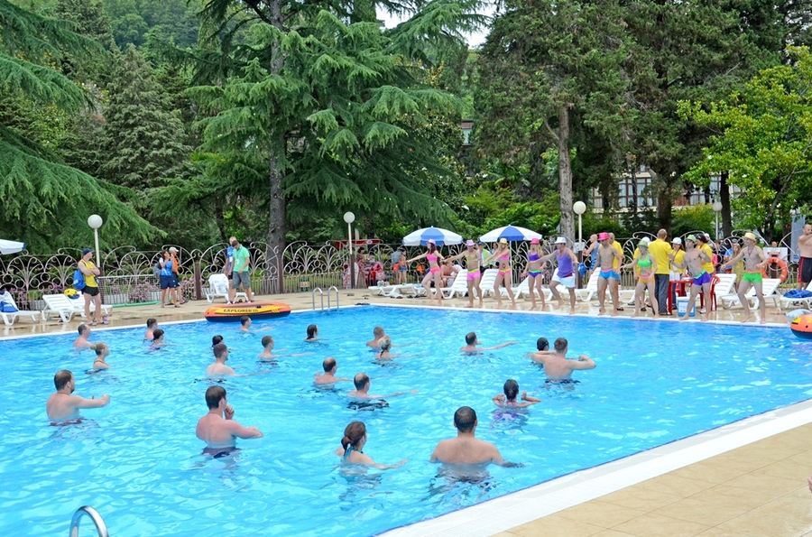 подогреваемой водой +27 C (всесезонный), с каскадным водопадом, противотоками и гидромассажем, длина дорожки 25 м, глубина 1,8 м; «малая чаша» бассейна (работает в летний период)