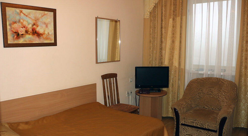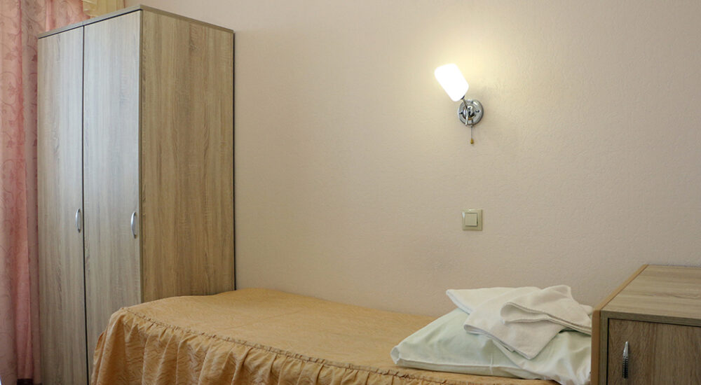 В номере: одна полутороспальная кровать, прикроватная тумбочка, стул, шкаф для одежды, зеркало, вешалка для верхней одежды, холодильник, телевизор, телефон, чайник, чайный набор на одну персону