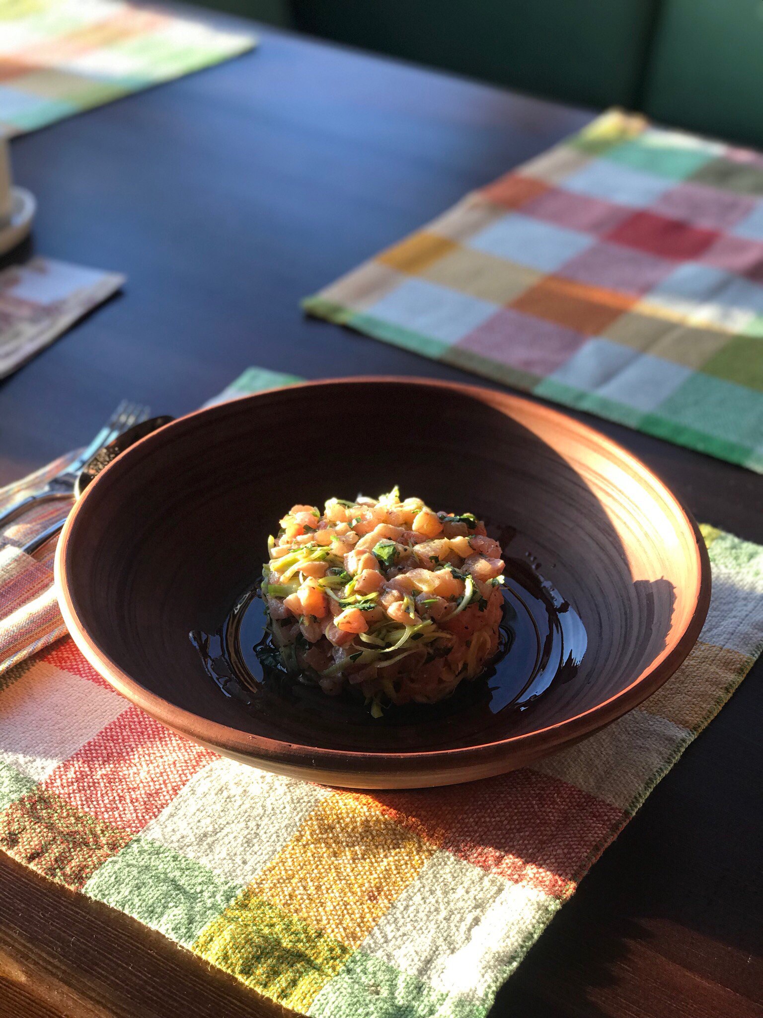 Интерьер ресторана сочетает в себе мебель из массива дерева, украшенные деревянные балками, глиняную посуду и текстиль, создавая благоприятное впечатление о месте. Каждая деталь помещения способствует общему уюту и выгодно смотрится в просторном зале под деревянным куполом.